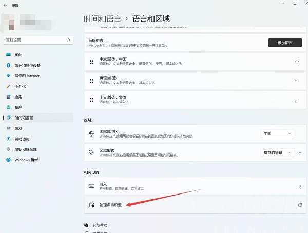 1、在设置中的左侧选择“时间和语言”,点击右侧中的“管理语言设置”。