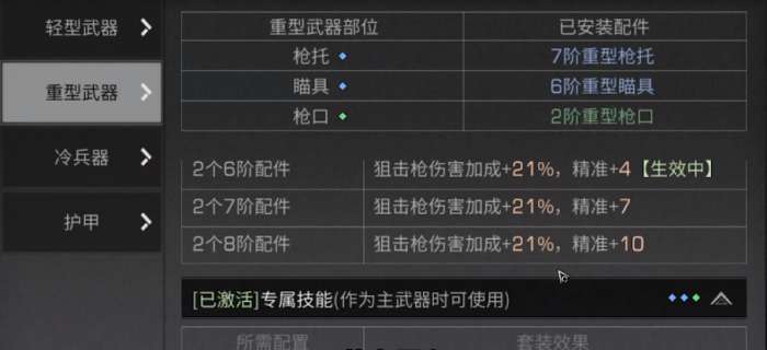 当重型武器装备上2个8阶配件时可获得10点精准时,若装备了3个6阶/7阶蓝配件或者3个6阶/7阶紫配件,还可额外获得15点精准值即,配件专属词条最高可提升25点精准值。