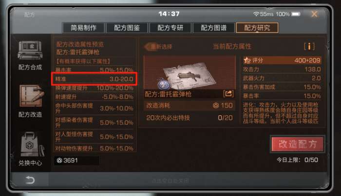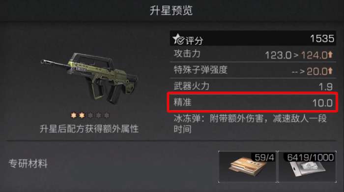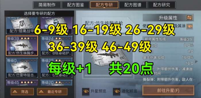 除了可以购买精准值较高的步枪外,幸存者还可以通过专研配方来提高精准值在步枪专研到6-9级、16-19级、26-29级、36-39级、46-49级时都可提高1点精准总共20点。