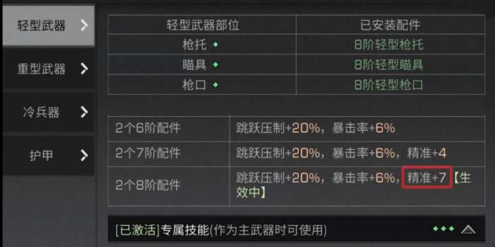 当轻型武器装备2个8阶配件时可以获得8点精准值。