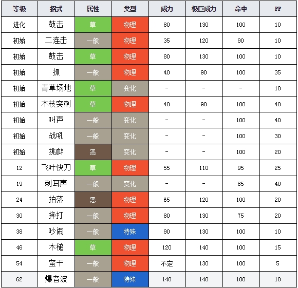 有独门技能打鼓,打落,木锤,莽撞等热门技能,还有挑衅,噪音,青草场地变化技能,爆音波虽然是高威力技能,但猩猩特攻种族60,没什么实战作用。