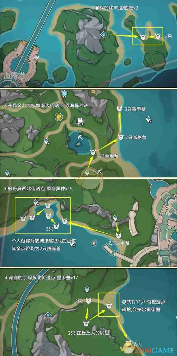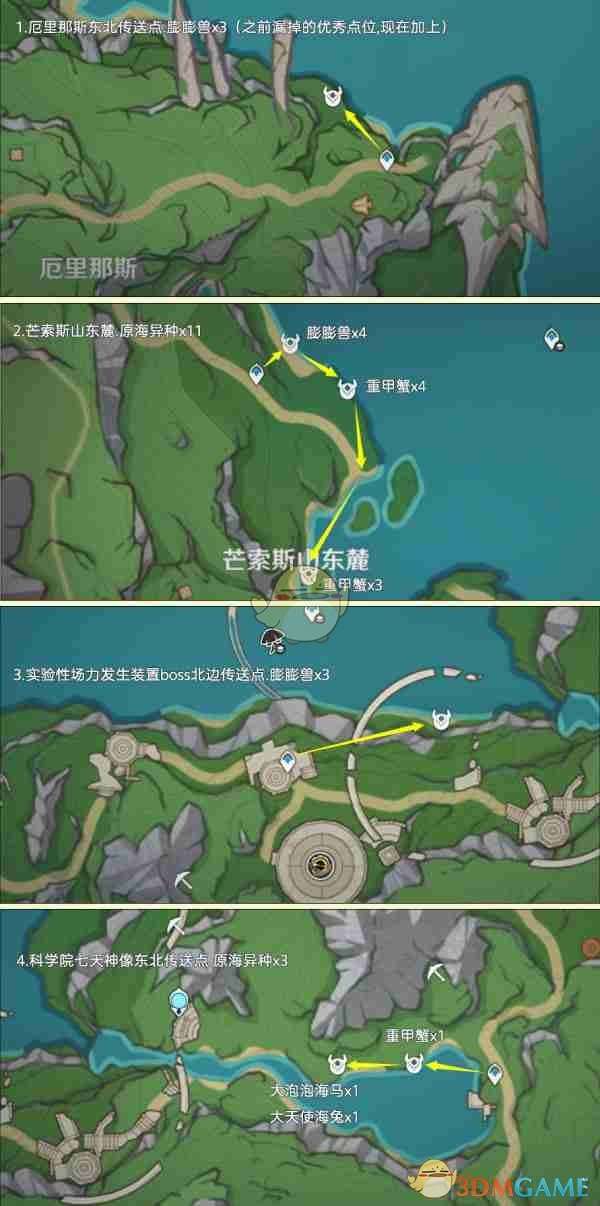 路线3:厄里那斯东北传送点、芒索斯山东麓、实验性场力发生装置、科学院七天神像