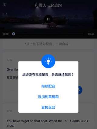 日语配音秀app怎么删除合配,用户只需选择你想要合配的视频,根据段落点击录音即可进行合配,如下图所示,如果你想要退出并删除合配,只需点击左上角的“返回”选项,选择其中的“直接返回”即可删除正在录制的合配配音,还可以在我的配音中找到“我的合配”与“草稿箱”,选择你想要删除的合配视频进行删除即可。