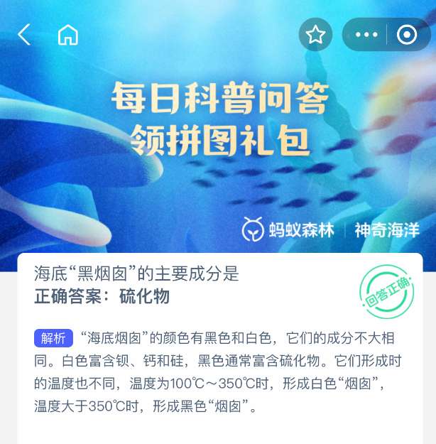 支付宝蚂蚁森林神奇海洋2025年6月22日问题已经更新,今日题目是:海底“黑烟囱”的主要成分是?正确答案是:【硫化物】。“海底烟囱”的颜色有黑色和白色,它们的成分不大相同。白色富含钡、钙和硅,黑色通常富含硫化物。