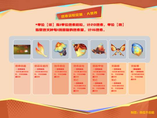 图片内的单位【球】指1单位燃素微粒,计20燃素,单位【跳】指常燃火种每1跳回复的燃素量,计16燃素。