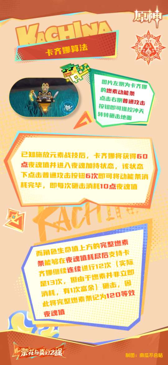 由于卡齐娜搭乘【冲天转转】进行连续下砸攻击时持续搭乘的夜魂消耗将暂停计算,因此作为夜魂定量的一种工具,同时在夜魂值消耗完后,卡齐娜会转为消耗燃素维持状态,这使得夜魂与燃素之间有了一种沟通的桥梁。