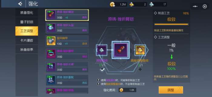 装备制造工艺(1%-100% 随机)影响基础属性,消耗调整晶体可随机调整,高能调整晶体不会降低工艺。