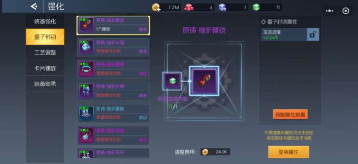 解锁装备额外属性,消耗解封粒子随机获取属性,高级解封粒子必获 3 个属性;可通过变换物质更改属性,锁定词条会增加消耗。