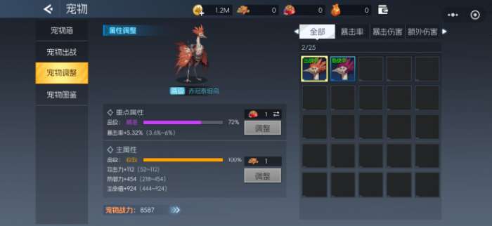 消耗宠物粮调整宠物主属性、重点属性品级,品级越高属性加成越高。