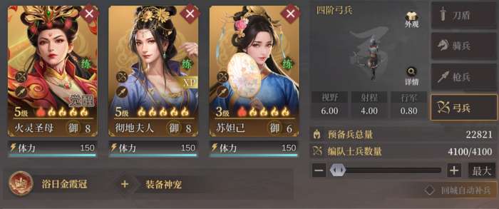 阵容方面,火灵圣母+彻地夫人+苏妲己组燃烧弓。苏妲己提升全队智谋伤害,同时带回蓝术法续航,火灵圣母和彻地夫人发动术法灵宝,打出高频次群体智谋伤害。燃烧弓阵容有火灵圣母最佳,没有的话彻地夫人平替。第三人除了苏妲己,上赛季的辛环、雷鹏有谁用谁,都可以替换。