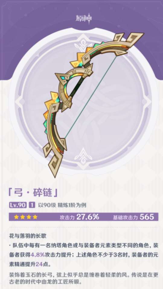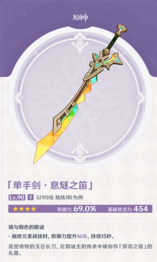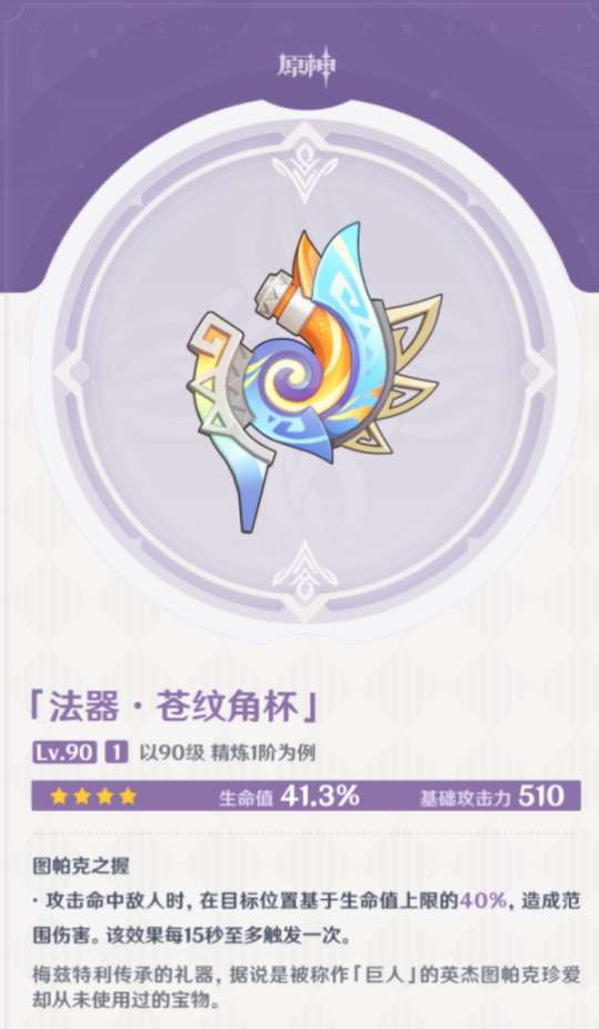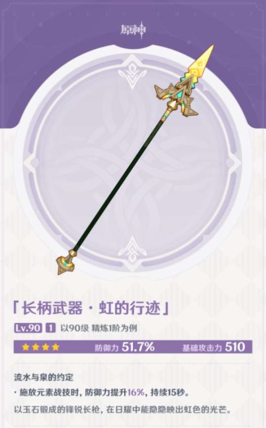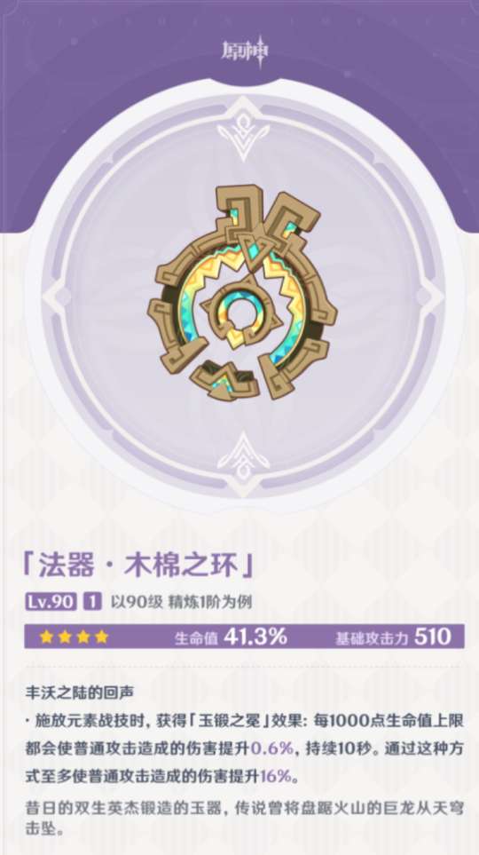 副词条是百分比防御,可以释放元素战技获得防御力提升,目前看来适配云堇和卡齐娜(新四星),价值一般。