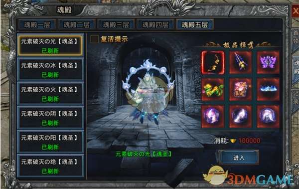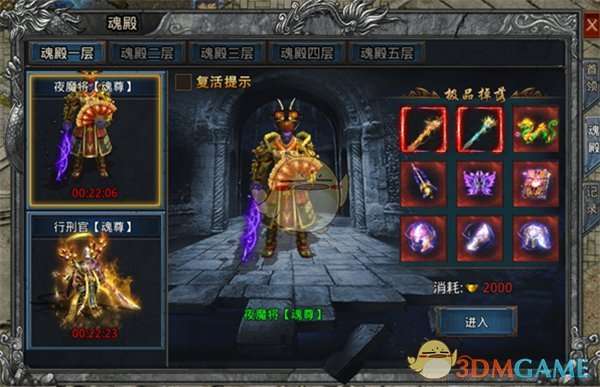 魂殿共分五层,前三层每层各有2只boss , 第四层和第五层各有6只boss,每一层都可掉落特殊装备“魂器”,boss难度越高则可掉落的奖励越丰富。