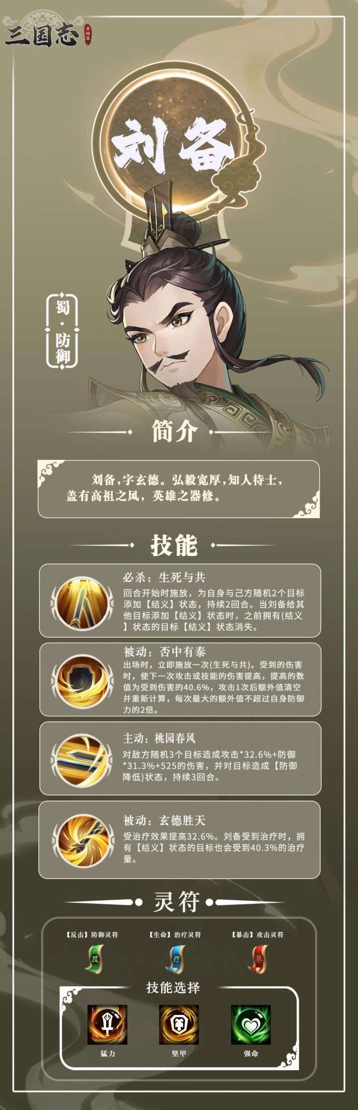 刘备是生存、保护为主的防御武将。生命防御图腾的收益最大