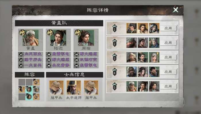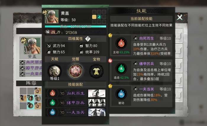 基于机制特性,黄盖最高效的应用场景为“东吴灼烧队”。推荐固定搭配为:黄盖、陆逊、周瑜三人组成核心输出链。兵种配置上,前排部署两支藤甲兵与黄盖协同承伤;中排由陆逊与周瑜站位,最大化灼烧叠加与范围伤害覆盖;后排配置太平道师,提供关键治疗与状态维持。技能配置方面,黄盖作为前排主坦,需优先保障生存与团队辅助效能:主动技选用“向死而生”,该技能在黄盖单次受到相当于最大兵力10%的伤害时触发治疗,有效缓冲“苦肉计”带来的血量波动;追击技推荐“缮甲厉兵”,可为自身及相邻追击格单位提供格挡率加成,每层+15%,最多叠加3层,持续2回合;被动技选择“一夫当关”,同步降低自身输出与所受伤害,在灼烧队强调持续作战的节奏下,显著提升整体容错率。