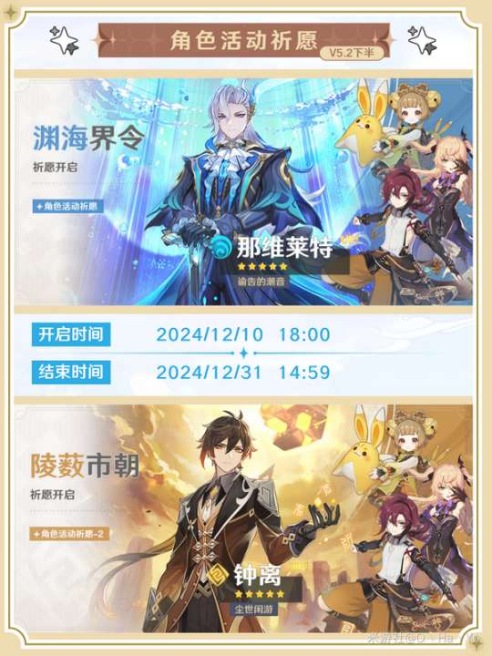 各位旅行者们,大家好,这次带来了5.2版本下半的【角色活动祈愿·渊海界令】&【角色活动祈愿-2·陵薮市朝】UP角色的《一图流攻略》