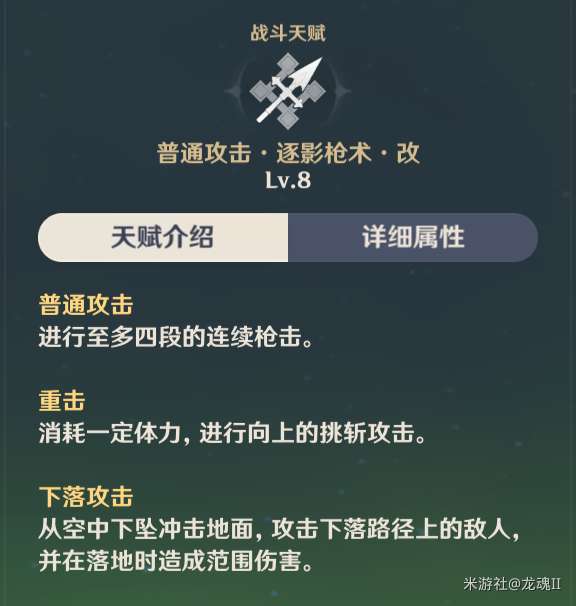 调香师是一名长枪角色,其普通攻击有四段式,非突刺重击在长枪中并不常见。不过,普通攻击的最后一段动作过于耗时,甚至比重击还要长。因此,在使用普通攻击时,通常会避免使用最后一段,而选择使用重击,这样还可以获得多一个附着的机会。