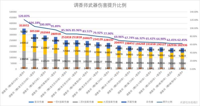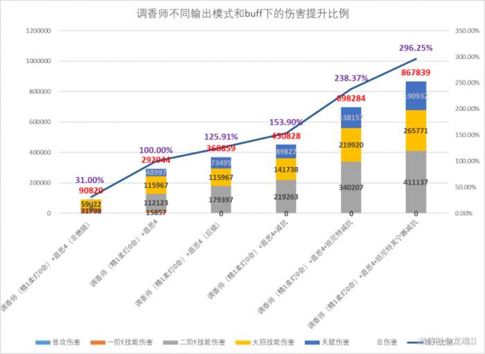 调香师可以吃到的buff其实不太多,这里主要分析下不同输出条件下调香师伤害的变化,计算结果如下: