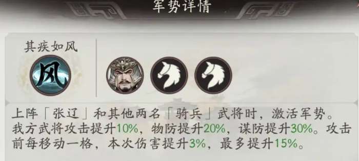张辽属于骑兵阵营的代表人物,其军势技能得额外安排两位骑兵武将才可激活,最大的特点就是移动距离越远伤害越高,最多能移动5格距离实现满层增伤的效果。想要让张辽的军势发挥出最大的作用,骑兵角色的搭配就显得尤为重要。在实际游戏过程中,张辽这类能够与骑兵队伍进行搭配的人物就非常合适,特别是在游戏开始阶段,骑兵角色在游戏过程中获得的较多,例如关于、夏侯惇等,因此张辽的军势与队伍的契合度非常高。