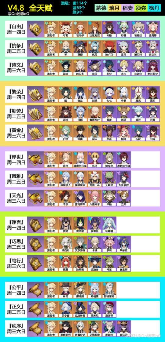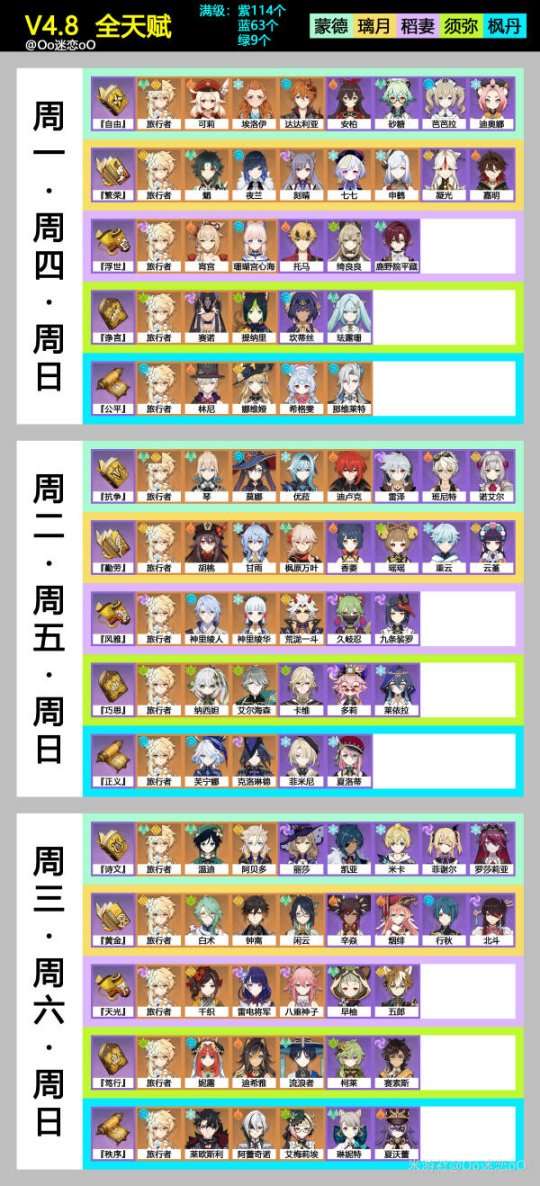 【浅蓝字体】一个角色满级天赋需要天赋材料:紫色114个、蓝色63个、绿色9个