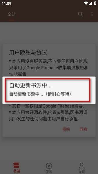 打开繁花小说app后,系统就会提示“自动更新书源中”,大概几秒钟就好了;