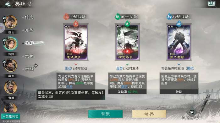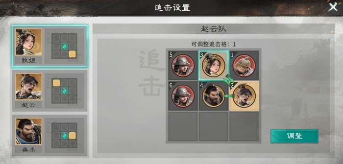 甄姬的自带天赋可以为赵云回复兵力并且提升赵云的闪避概率。赵云修改追击格为右上,让甄姬可以站在赵云的追击格内触发追击技能。