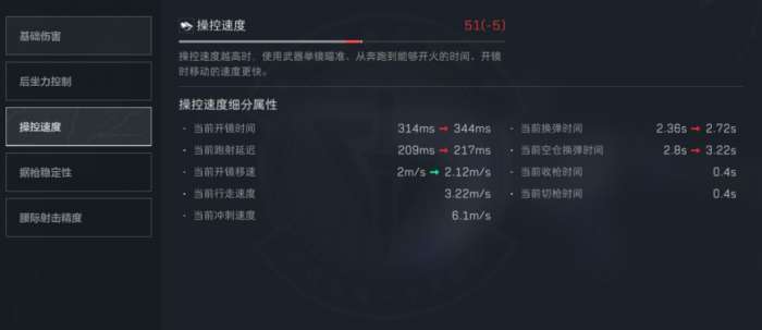 只不过因为我们这套方案同时选择了长枪管与大弹匣,所以它实际的操控速度表现并不是特别好。344ms的开镜时间和217ms的跑射延迟,基本意味着它就只能乖乖架枪了。