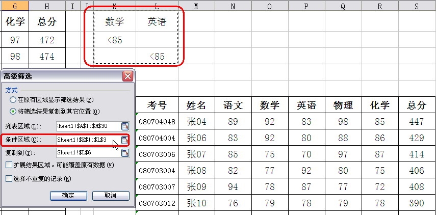 我们需要设置筛选条件:在K1和L1单元格分别输入“总分”和“数学”(与前面成绩表中相应列的标题文本要保持一致,格式不限),在K2单元格输入“>=400”,在L2单元格输入“<=85”。