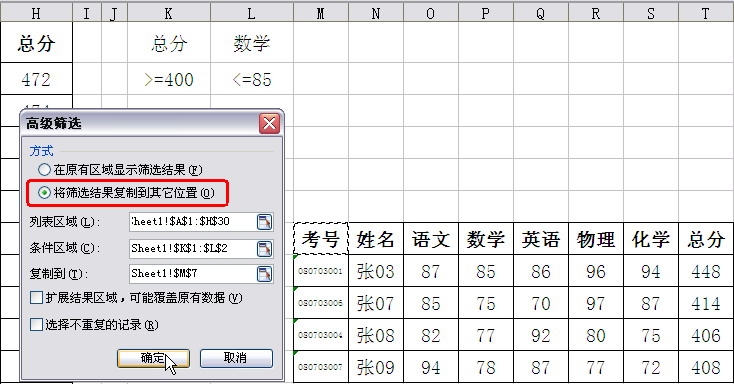 点击菜单命令“数据→筛选→高级筛选”,打开“高级筛选”对话框。选中“将筛选结果复制到其它位置”单选项,点击“列表区域”输入框右侧的图标,然后框选原始成绩所在的区域“Sheet1!$A$1:$H$30”,再点击图标回到对话框。同样的方法设置“条件区域”输入框为 “Sheet1!$K$1:$L$2”,然后在下方的“复制到”输入框中输入筛选结果表格的起始位置“Sheet1!$M$7”(这些单元格区域也可以手工输入),确定后就可以看到筛选到的结果了: