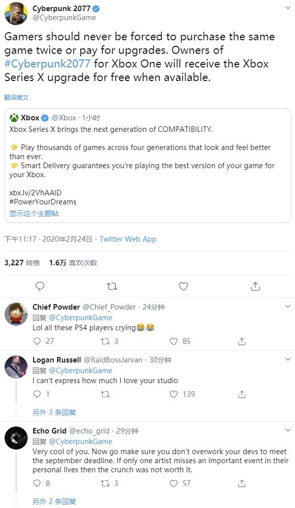 CDPR的《赛博朋克2077》官方推特日前回应了Xbox官方刚确认的游戏兼容性以及智能交付特性(关于Xbox X主机特性的介绍),表示玩家不应该强迫为一款同样的游戏支付两次或者为升级掏钱,自家《赛博朋克2077》的Xbox One版将在未来免费获得Xbox X版升级。