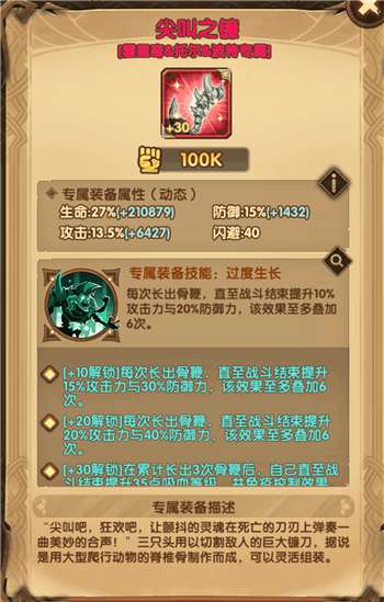 专属是对大招的加持,每次释放大招就长出骨鞭,每次长出骨鞭就提升攻击和防御。累计3次后,会额外提升35点吸血并免控。这个累计的防御和攻击最多是6次,也就是最大可提升120%的攻击和240%的防御,实际上一次战斗最多也就释放2-3次的大招,在没有加速的情况下。这个专属再次证明了,三头是“活久见”型输出英雄,活的越久越暴力。建议专属要么10要么30,专属30以后三头会肉好多,3次大招后能免控。