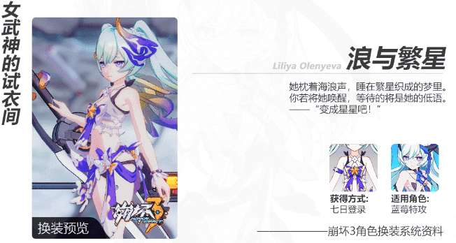 在4.1版本更新后,游戏内将开启「浪与繁星之梦」七日登录活动,累计登录七天,即可领取「蓝莓特攻」夏日服装「浪与繁星」、水晶等奖励~