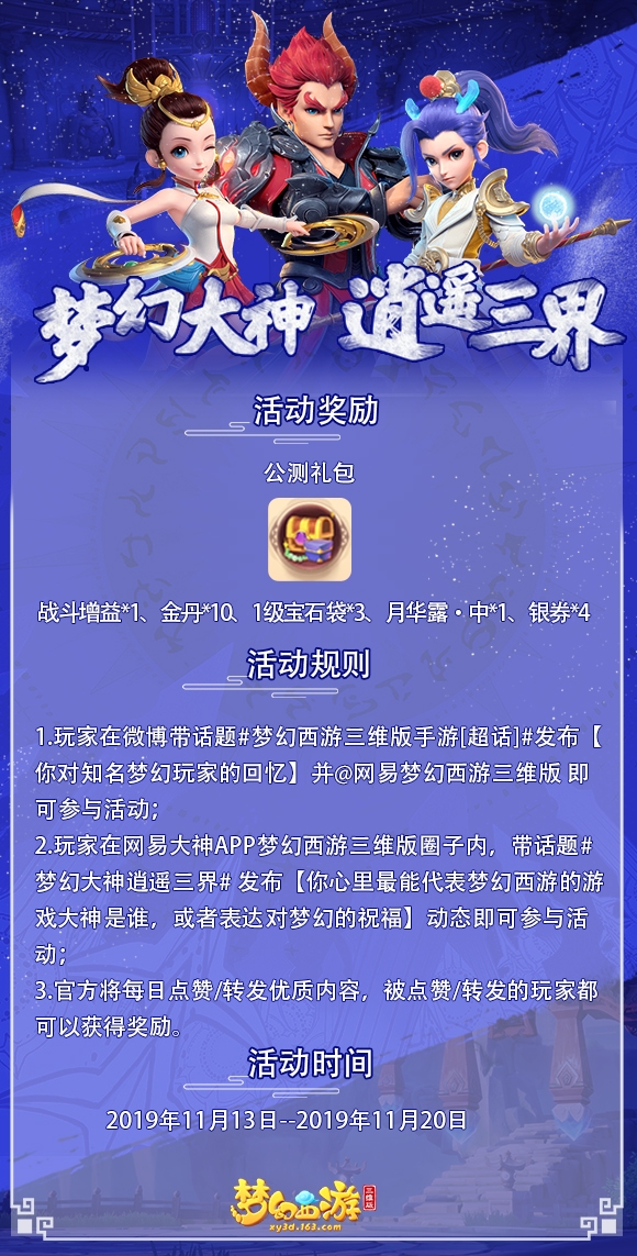 1、在微博平台,玩家只要在话题#梦幻西游三维版手游[超话]#下发布【你对知名梦幻玩家的回忆】并@网易梦幻西游三维版 官方微博即可参与活动;