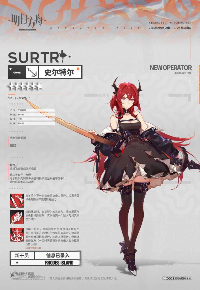 先来说说史尔特尔的背景故事和设定,从双角不难看出她是一名萨卡兹,但档案上却说她“过往一片空白,几乎无法使用源石技艺,身体素质也十分普通”,跟过往我们对萨卡兹的普遍认知有不少出入。而她的战斗力主要源自于随身携带的双手大剑,而这把大剑应该也有自己的意识,颇有些“魔剑”的味道在其中。另外不得不再次赞美ask老师,画的立绘是在太干净太好看了!