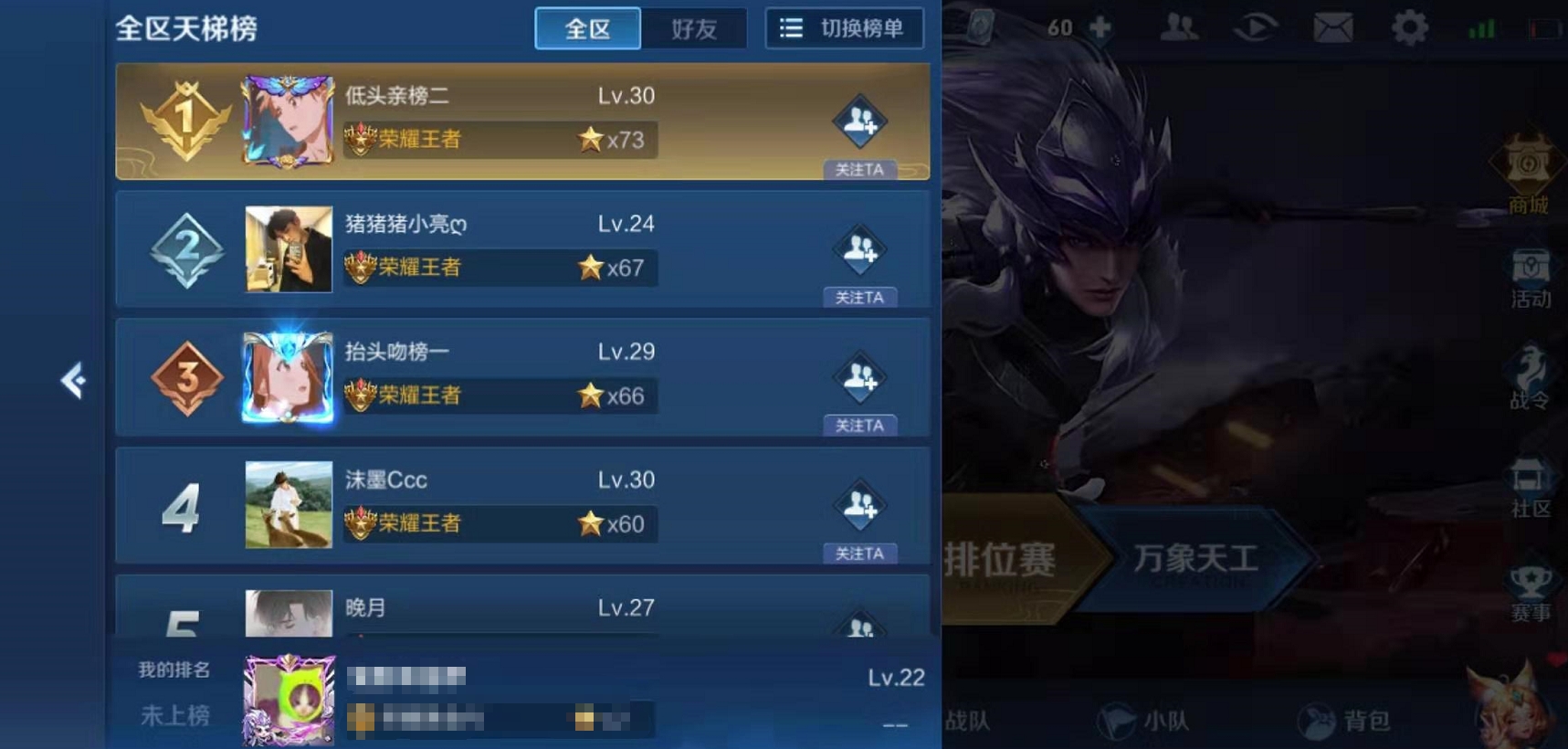 王者:王者已经是大神的段位,已经超越段位的攀比,开始注重名次,赛季结束后系统会通报进入排名的玩家,这是非常值得炫耀的事。
