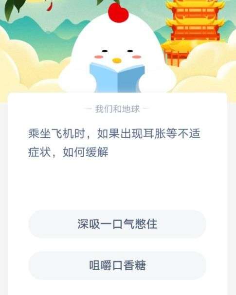 乘坐飞机出现耳胀如何缓解,蚂蚁庄园今日题目和做飞机有关,那么大家在飞机上出现不适如何应对,下面为大家介绍蚂蚁庄园1月21日答案。