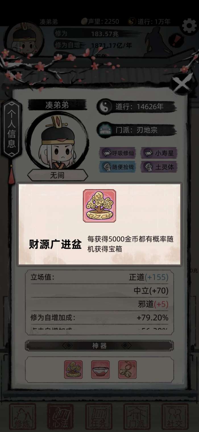 剩下的就是无脑升红色功法然后升天了,只要你第一次升天有下面这个宝物,这个游戏就已经差不多通关了,升天进宗门换宝物,只要开到第一个十万的宝物卖了就有一堆宝箱了,后面就已经不缺钱了,这个游戏的玩法有点多,但是可玩性的点不多。