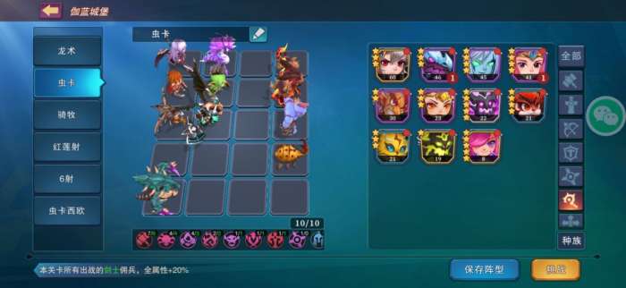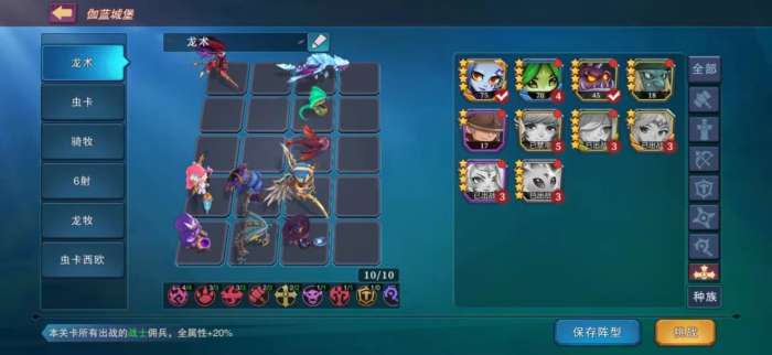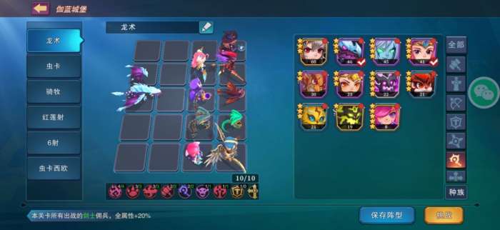 站位随意,我是玩虫子的,主要练度就是蜘蛛,而且珈蓝20层后会BAN蕾娜,所以蕾娜工具人,不需要练度。大家可以看到,我弓队基本没练度,全靠神卡树叶精一进6坚守锻12。打法喵酱过滤牌库找射手天赋,给蜘蛛套上,然后复制红莲唱歌就完事了,蜘蛛差不多1万攻就可以启动,让树叶精上链接,一键清屏。另外黑科技术士老头,能量缺失让萨菲放不出大招,完美拖到12回合,就可以启动了。专打下面2种队伍: