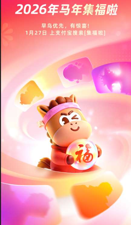 2026年支付宝马年集福活动将于1月27日开启。用户可搜索“集福啦”提前参与,除传统五福外,今年新增马年专属玩法及迪士尼、NBA等IP联名稀有福卡。具体活动规则与总奖金额度请关注后续官方公告。