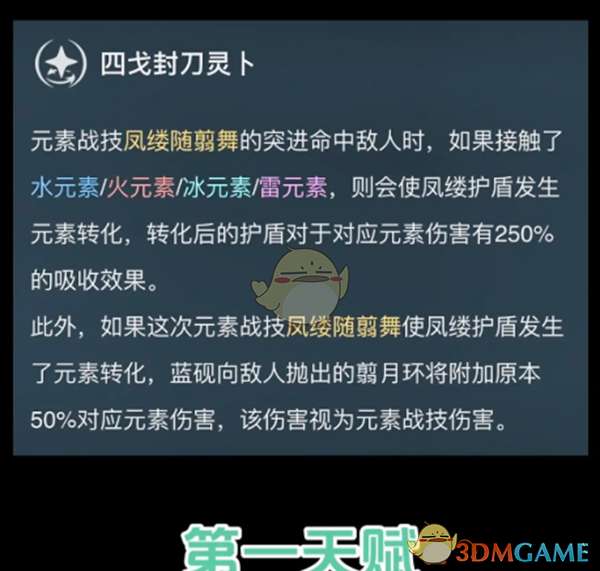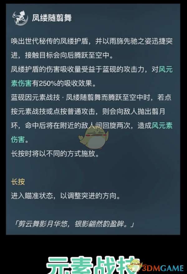 唤出世代秘传的凤缕护盾,并以雨旆先驰之姿迅捷突进,接触目标会向后腾跃至空中。凤缕护盾的伤害吸收量受益于蓝砚的攻击力,对风元素伤害有250%的吸收效果。蓝砚因元素战技·凤缕随翦舞而腾跃至空中时,若点按元素战技或点按普通攻击,则会向敌人抛出翦月环,命中后将在附近的敌人间回旋两次,造成风元素伤害。长按时将以不同的方式施放。