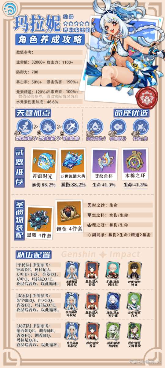 [玛拉妮]是一位拥有高机动性的水元素输出型角色,通过释放[元素战技]进入【夜魂加持】状态,此状态下可以高速移动,碰撞到目标会给对方施加标记获得特殊充能,提高对标记目标造成的伤害,命中后玛拉妮还会向所有标记的敌人发射飞弹。