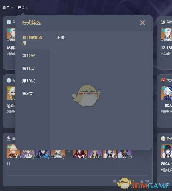 1、首先在深境螺旋广场中,点击角色和模式进行筛选;