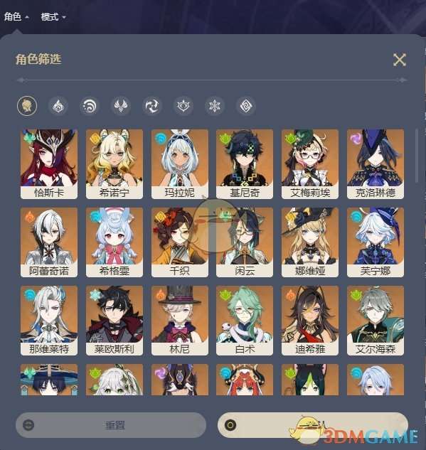 2、角色可以按照元素分类筛选,筛选之后点击确认;
