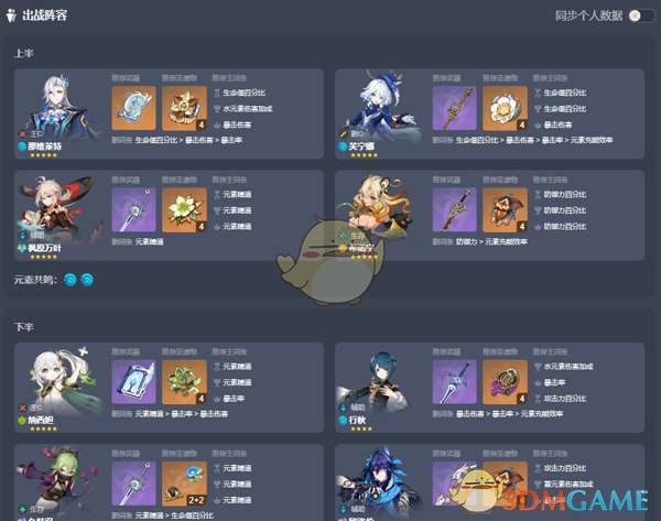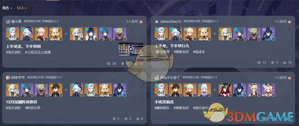 5、最后随意点击一个阵容查看,即可看到该阵容下角色、武器、圣遗物的搭配。