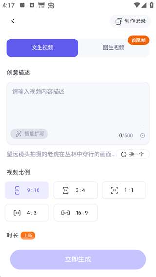 3、选择你喜欢的模版,提供两种创作模式【文生视频、图生视频】描述内容点击立即生成即可