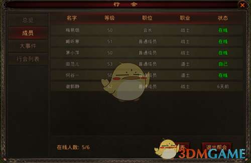 2、在成员页面,可以查看和管理行会的成员。点击列表的玩家可以对玩家进行查看、私聊等操作,若是会长还可以将该玩家进行提出行会和给予职位等,退出当前帮会的按钮也在这里哦。