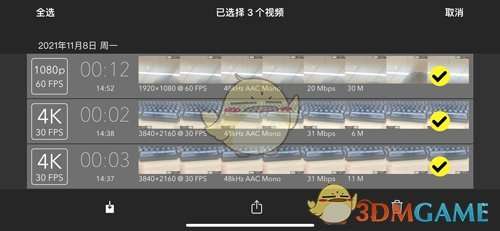2、这个时候你们可以看到右上角的地方有一个【选择】,然后你们就可以看到你们想要选择的视频,然后最下面的地方可以看到一个【下载】的按钮,然后中间是分享的按钮,可以是分享到微信等,后面那个是删除的按钮。