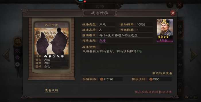 从技能的角度看,张鲁的养马有道战法表面上来看是委任和后勤,但是在一些副本战斗中有时会体现为“降低敌方出征效率”或者“减少士气消耗”,使玩家在持久战中容易处于被动地位。因此对抗张鲁的主要策略就是速战速决。推荐使用张飞的“燕人咆哮”、关羽的“青龙偃月”或者诸葛亮的“八阵图”等带有强控和爆发的战法,用高频输出和控制相结合的方式打断张鲁的防守节奏。