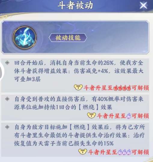 而相比单纯的主动技能释放燃烧效果之外,天雷子的被动技能效果反而更多,而且是随着不同星级不断升级变化出更多能力的,一开始的被动当中是可以在回合开始后,消耗天雷子自身当前生命的26%数值,此时就可以使我方全体斗者获得增益效果,这里的增益是体现在伤害数值上面,对面造成的伤害施加到天雷子身上的时候会减免掉4%的数值,而且这个效果可以叠加到3层的时候,这里减免的效果就达到12%左右的数值了,且在后期升星之后他就可以在自身受到普攻的直接伤害后,还有40%概率对伤害来源单位施加持续1回合的燃烧效果,如果是天雷子为敌方目标施加燃烧效果后触发被动的话,他可以将为己方所有斗者里生命最低的斗者提供生命治疗效果,这里的治疗恢复值为天雷子当前已损失生命的15%,所以如果天雷子如果是在后期触发这个被动的情况下,反而给我方带来的回复数值更高,直到天雷子阵亡时,还会为我方全体斗者提供生命治疗效果,这里的治疗恢复值为天雷子最大生命上限的36%,最后一个阶段也会让我方队伍的生存时间变得更长。