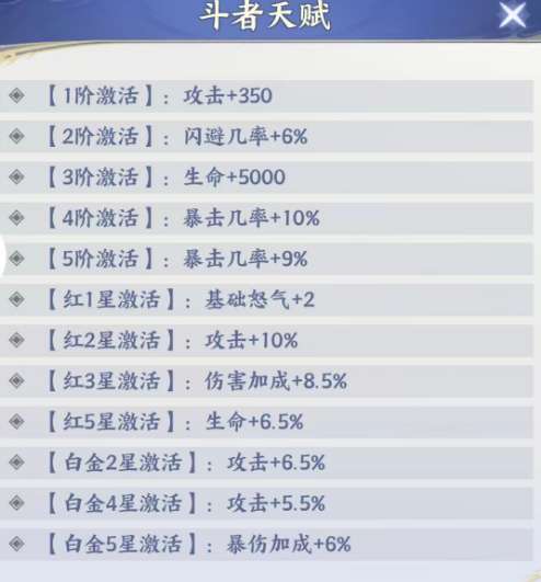 斗者天赋当中天雷子每一个阶段能够触发的加成属性以及数值都是不一样的,1阶的时候激活的是基础的攻击+350,而在2阶激活的就是闪避几率+6%,还有3阶的时候可以激活生命+5000的数值,这个数值不算很低,至少在天雷子需要生存的时候可以带来不错的时长,然后4阶跟5阶都是激活暴击触发的概率,不过一个是增加10%,还有一个是9%,后期在升星之后达到红1星就可以激活基础怒气+2点的效果,还有红2星时期的攻击+10%也可以用起来,红3星激活的则是在伤害加成上面的数值,虽然只有8.5%的数值,但是也比刚开始的天雷子强了,还有后期在暴伤加成+6%的数值当中都是提升他在实战里面的数据。