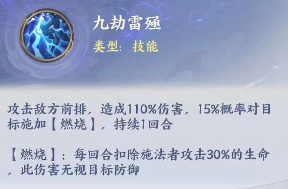天雷子目前不仅仅是自身的潜力高,这个角色可以在火队当中产生足够多的灼烧效果,而且还有不错的免伤效果可以带来,所以在当前使用这个角色的时候大家可以先考虑他主动释放的技能,当然普攻能力一般就是单体输出,所以大家还是要更关注九劫雷殛这个技能才行,这个技能可以让天雷子主动攻击敌方的前排,造成110%伤害,其中还有15%概率对目标施加燃烧效果,不过游戏中因为燃烧效果的杀伤力比较强,所以这里的持续回合是比较少的只有一个1回合大家可以利用起来,而这一个回合当中的燃烧是会扣除施法者攻击30%的生命,而且这一类型的伤害会无视目标的防御数值。